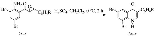 We envisaged that the trans-2-aminochalcone epoxides 2 would undergo direct one-pot sequential acid-mediated cyclization and aryl migration of the intermediate trans-2-aryl-3-hydroxyquinolinones to yield the corresponding 3-azaisoflavones, exclusively. In our view, efficient solvation by the strongly polar protic acid and intermolecular hydrogen bonding would probably stabilize the trans conformer of the incipient 2-aryl-3-hydroxy-2,3-dihydroquinolin-4(1H)-one intermediate and, in turn, facilitate aryl migration to afford the 3-azaisoflavones as sole products. In order to prove this assumption, we subjected epoxides 2a–c to an excess of sulfuric acid (3 mol equivalent) in dichloromethane at 0 °C for 2 h with thin-layer chromatography (TLC) monitoring (Scheme 2). Thin-layer chromatography analysis of the reaction mixtures revealed in each case the presence of a single spot, which upon aqueous work-up and recrystallization were characterized using a combination of spectroscopic techniques as the azaisoflavones 3a–c. The NH-4-oxo nature of the potentially tautomeric 3a–c in solution was confirmed by the presence in the 13C-NMR spectra of a singlet around δ 173.5 ppm, which is typical for the carbonyl carbon for the quinolin-4(1H)-one framework []. Their ketone nature in the solid state, on the other hand, was confirmed by the intense infrared carbonyl absorption band in the region νmax 1645–1655 cm−1.