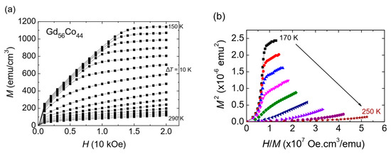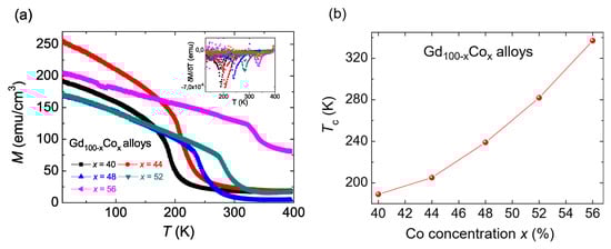 The thin films were deposited at room temperature on (100)-silicon substrates by the sputtering deposition technique. The chamber base pressure was 10−7 Torr. A 3 nm-thick Ta layer was used as a buffer layer, while a 3 nm-thick Ta capping layer was used to prevent the oxidation of the rare-earth elements. The deposition rates for Gd and Co targets at 50 W and 100 W were 0.719 Å/s and 0.456 Å/s, respectively. The thickness of Gd100−xCox (40 < < 56) alloy films was kept constant and equal to 100 nm in order to ease the comparison of the magnetocaloric values. The Gd100−xCox (40 < < 56) alloy films mostly consisted of an amorphous phase, as depicted in the measured XRD patterns (see Supplementary Materials, Figure S1 for XRD patterns of the studied Gd-Co alloy thin films). The magnetic characterization was carried out using a Quantum Design© SQUID-VSM, where the magnetic field is applied in the sample plane.