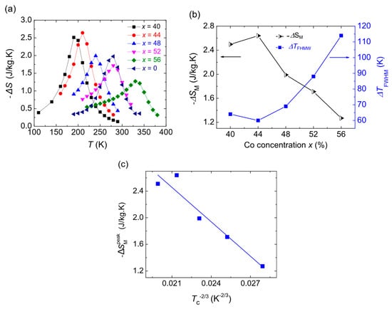 We compared the values of –ΔSM obtained for the investigated Gd100−xCox alloys with x = 56, 52, 48, 44, and 40 with those obtained for a 100 nm-thick Gd layer, as depicted in Figure 3b. The maximum values of the –∆SMpeak (T) curves are obtained close to Tc. The peak temperature in –∆SM (T) is shifted towards high temperature by increasing x, which is most likely due to the enhancement of the Gd–Co indirect interaction. Figure 3b shows the evolution of the peak entropy change value and its full width at half maximum (FWHM) as a function of the Co concentration x. It can be clearly seen that the decrease in peak –∆SM is accompanied by an increase of the FWHM. The maximal entropy change is observed for x = 44, and is about 2.65 J/kg.K. Figure 3c shows the evolution of –∆SMpeak as a function of Tc−2/3 for the investigated Gd100-xCox alloys (x = 40, 44, 48, 52, 56) under the applied magnetic field of 2 T. It can be seen from Figure 3b that –∆SMpeak changes linearly with Tc−2/3 (or (708.8–8.83x)−2/3 with a linear correlation coefficient above 0.992), indicating that –∆SMpeak of the Gd100−xCox alloys can be easily tailored by adjusting x.