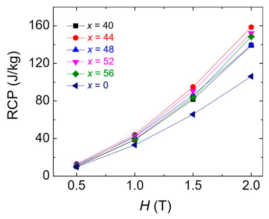Relative cooling power (RCP) as a function of the applied magnetic field for the Gd100−xCox alloy films.