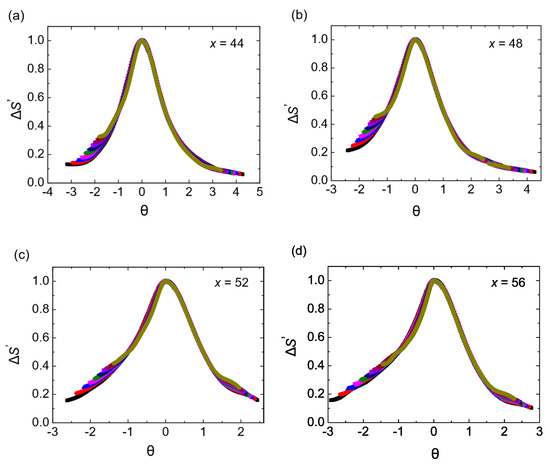 Universal scaling analysis indicates that the Co helps to homogenize the magnetic properties in GdCo thin films [25]. Such a method should remove the temperature and field dependence of the set of curve (for fixed ), so that all curves processed with the same scaling protocol collapse onto a single universal curve. A failure to display this universal collapse can be attributed to material inhomogeneity [30], likely in the form of a distribution of exchange energies. Figure 5 shows the universal curve construction for each of the studied Gd100−xCox thin films by plotting ΔS′ against θ, where is the rescaled entropy change and θ is the rescaled temperature variable as follows: