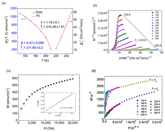 where is the reduced temperature, and and are the critical amplitudes. Initial values of and are selected, then a plot of as a function of was obtained [12]. The high field linear region (H > 1) is used for the analysis, because the Modified Arrott Plots (MAPs) tend to deviate from linearity at low field due to the mutually misaligned magnetic domains. The values of and can be then determined from the intersection of the linearly extrapolated curves with the and , respectively. Figure 6a shows the temperature dependence of and , which are fitted with Equations (1) and (2). The fitting enables us to obtain new values of and , which are then used to construct new MAPs. These steps are therefore repeated until the iterations converge to the optimum values of , , and Tc. Therefore, the MAPs shown in Figure 6a yielded the following results: and . Figure 6b depicts the modified Arrott plots, which show that all lines are parallel to each other. On the other hand, the fitting of the M-H measured at T close to Tc using Equation (3) enables to extract the value of the critical component :