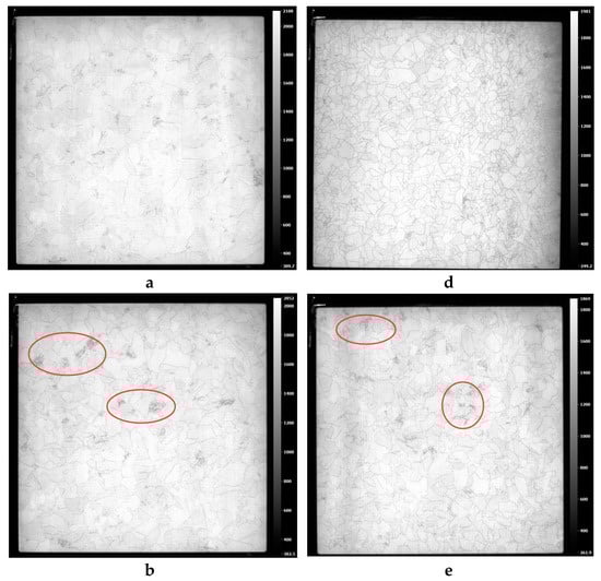 With the growth of the ingots, dislocations (black region) in the ingots proliferated and diffused along the direction of growth. In the mid-growth stage, the dislocation density in the ingot seeded by mixed seeds increased (shown in Figure 8e), but the uniformity of grain size remained at a high level. However, the dislocation density of the fused quartz-seeded ingot in Figure 8b was significantly higher, and most dislocations were concentrated in areas with fine grains. This is because the growth rates of grains with different sizes were different; large grains are continuously extruded and eroded by surface energy, resulting in additional extrusion stress, which lead to more dislocations [].