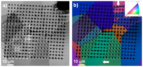 (a) Image quality (IQ) and (b) local crystallographic orientation map of an indentation array of 400 imprints (20 by 20) done at a maximum displacement into surface of around 200 nm. White arrows in Figure 1b show the pre-existing twins.