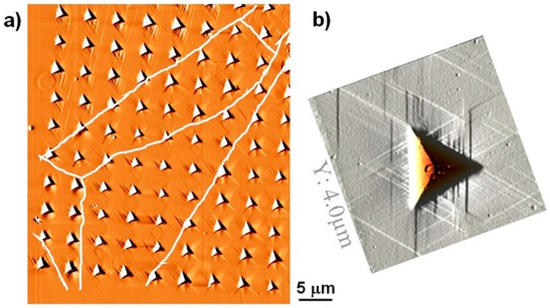 (a) Set of twelve overlapped atomic force microscopy (AFM) images (error signal mode) exhibiting the main plastic deformation mechanisms around the residual imprints. (b) AFM image of one indentation.