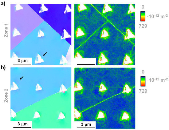 Figure 3 exhibits the images of two different regions with several residual imprints (identified with white full line rectangles in Figure 1a, labelled as 1 and 2). GND maps are presented in the right hand side of Figure 3a,b, respectively. The plastic field produced by the nanoindentations induced lattice rotations (see black arrows) is clearly depicted in the local crystallographic maps presented in Figure 3a,b. As discussed by several authors [31,32,33,34], this phenomenon may be attributed to the activation of different slip systems due to the complex indenter geometry, causing a gradual change in the loading axis during the indentation process. On the other hand, as reported by Roa et al. [23], the (001) plane presented lower hardness than the (111). This behavior might be related to the necessary condition to increase the stress to activate dislocation sources, and successively move the dislocations, resulting in higher hardening gradients. Within this context, the GNDs map provides information about the dislocation activity for different crystallographic orientations; see right hand side in Figure 3a,b.
