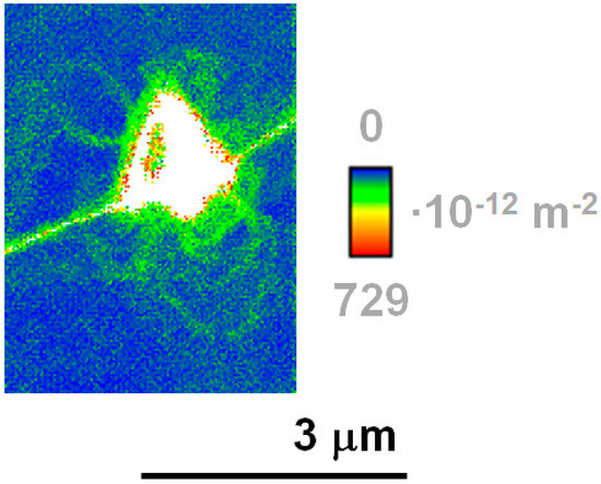Figure 4 presents a magnification of the GND map for an imprint performed at the GBs. Clearly, the maximum GND density was observed at the edge of the residual imprint where, as already mentioned, the induced field stress was complex. On the other hand, due to the complex stress induced at the edge of the residual imprint, the maximum amount of deformation was in the order of 7 × 10−10 m−2. Furthermore, the stress field induced by the Berkovich indenter produces a multiplication of dislocations by Frank–Read sources, as clearly described Hull et al. [35]. In TRIP steels, as the GND maps highlighted, some dislocations are allocated partially in their slip planes; predominantly in the maximum density (close packed) plane for the f.c.c. (face centered cubic) structures. Within this context, during the indentation process the shear stress field produces a displacement of the crystal above the slip plane relative to that below by one atom spacing b. This process is regenerative, since it can be repeated until the dislocation source reaches the surface. In other words, the shear stress, τ, exerts a force τ·b per unit length of line and tends to make the dislocation bow out. Moreover, as is evident in the GND maps, the radius of curvature, R, depends on the stress applied. Thus, as τ increases, the R of the slip line decreases and the line bows out until the minimum value.