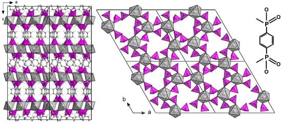 Crystal structure of 1,4-phenylenebis(phosphonate) Ce(III) with the Cambridge Structural Database (CSD) reference code MAXFEY consisting of 2D layers that are connected by the linker [34]. From the side view along the a direction, the crystal structure is similar to ICR-9. However, the coordination of Ce(III) (grey polyhedra) by oxygen atoms as well as its arrangement in the 2D layer are different in comparison with octahedral coordination and honeycomb arrangement of Ce(III) in ICR-9. The tetrahedral environment of phosphorus atoms is depicted by magenta polyhedra. The schematic representation of the linker is in the bottom right corner.