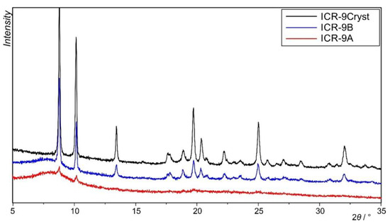 Comparison of the powder XRD patterns of ICR-9Cryst (black), ICR-9B (blue), and ICR-9A (red). The amount of the amorphous phase can be distinguished from the peak / background ratio and the wide peak between 6 and 12° 2θ. The least amount of the amorphous phase is in the sample of ICR-9Cryst, whereas the largest amount is in the case of ICR-9A.