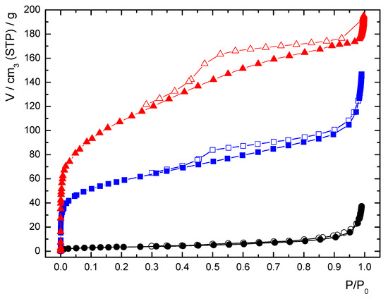 Nitrogen adsorption isotherms for ICR-9Cryst (black), ICR-9B (blue), and ICR-9A (red) at 77 K; adsorption is marked with full symbols and desorption with empty symbols.
