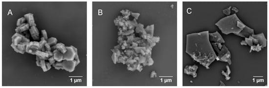 The SEM image of ICR-9Cryst (Figure 5) shows uniform, well-shaped particles with hexagonal structure. In the case of ICR-9A, the uniformity of the particles is lost, and sheet-like particles are accompanied by a phase of an unresolved shape. Similarly, ICR-9B formed sheet-like particles. However, the presence of the phase of unresolved shape is limited.