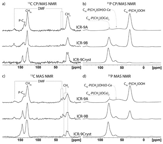 13C and 31P solid state NMR (ssNMR) spectra of ICR-9Cryst, ICR-9B, and ICR-9A: (a) 13C cross-polarization magic angle spinning (CP/MAS) NMR; (b) 31P CP/MAS NMR; (c) 13C MAS NMR; (d) 31P MAS NMR experiments.