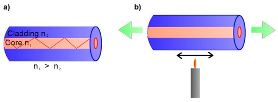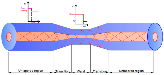 An optical fiber consists of two concentrically arranged dielectrics: the core and the cladding. The core is characterized by a higher refractive index than the cladding [8]. It determines light propagation in that structure based on a total internal reflection (Figure 1). The light is propagated in the form of modes in the core and a small part of energy penetrating the cladding which is named the evanescent field. During the technological process consisting of heating a certain part of the fiber and pulling it out, a tapered optical fiber can be created. The result of a fiber’s tapered structure is change in the core and cladding diameters (Figure 2). As a result, the field of the basic mode occupies an increasingly larger cross-section of the cladding until it reaches the point where it is guided in its entire cross-section. As a result, the field of the basic mode occupies an increasingly larger cross-section of the cladding until it reaches the point where it is guided in its entire cross-section.