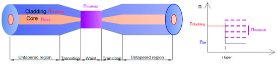 Such an approach allows us to use additional material in a tapered area especially in the taper waist region (Figure 3). In this region, the optical fiber will be sensitive to external changes of the reflective index of the material that surrounds the fiber. Such connections with various materials have been widely used to build sensors, filters, and amplifiers [22,23].