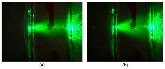 The reason for taking liquid crystals as a research object is that they are anisotropic materials possessing variable refractive index depending on the molecules’ orientation. It should also be mentioned that in many cases LCs have a higher refractive index than an optical fiber (propagation changes from total internal reflection to the band gap propagation or a mix of them for different wavelengths) which makes them most interesting materials. Additionally, LCs’ substrates create a resonance device which causes the situation that some part of the light is reflected from the glass with alignment layers and can be coupled back to the fiber taper. In a standard single-mode fiber (SMF) the basic mode is propagated. When we taper such a fiber, boundary conditions change and we can see many modes propagating especially in the taper waist area. An attitude mode begins to couple with cladding modes so that the light beam is modified. The light starts to leak from the taper’s structure to the liquid crystal cladding as shown in Figure 4. In LC, light beams are limited by the glass with alignment layers as it was mentioned earlier. Depending on the used voltage, the angle of LC scattering increases [see Figure 4b] [15,24].