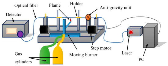 Tapering is performed by stretching the optical fiber above the flame from a low-pressure burner powered with a propane-butane-oxygen gas mixture. An appropriate proportion of this mixture and distance between flame and fiber allow for controlling flame temperature and, connected with it, drawing velocity. In this process, the temperature is most important because too high a temperature causes melting of the optical fiber and too low a temperature is not enough to soften the fiber, which results in stopping the stretching process. Appropriate temperature is the softening temperature of glass (around 1200 °C). A pure mixture of propane–butane and oxygen gases allows to obtain a homogenous and adequate temperature distribution. The velocity of fiber elongation is controlled by software which is based on a measurement of the transmitted optical signal magnitude. Additionally, the special anti-gravity unit is used because during the elongation process the fiber position is reduced. The signal increase in the anti-gravity system is an impulse for changing drawing velocity, as well as lowering the burner position [11,12]. Additionally, by selection of a proper flame, we can make a taper with a very small dimension of the taper waist. The main advantage of preparing tapered fibers on the FOTET are full control elongation parameters like elongation length, burner movement, and its distance from the fiber or step motors velocity, taper waist region diameter. Additionally, during elongation, changing optical power is constantly monitored by using a laser and a photodetector connected to the opposite ends of the fiber. Thus, attenuation after the finished tapering process can be easily calculated.