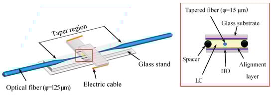 In the next stage, the tapered fiber LCCs were prepared. The initial arrangement of molecules is achieved by using a photoalignment poly(estermide) layer on the glass substrate covered with ITO (Indium tin oxide) (further called electrode) [31]. The obtained tapered fiber is placed on the electrode as close as possible but without touching it. The position is obtained with control of a CCD (Charge Coupled Device) camera with special objective lenses. Any contact between the tapered fiber and the electrode causes radiating out optical power and increasing losses. To maintain the same distance between electrodes, spacers with a diameter of φ = 40 μm were used. In this paper, the perpendicular arrangements of taper and electrodes were investigated. In this case, the top and bottom electrodes have a perpendicular direction of the alignment layer with respect to the fiber/taper axis. Prepared cells are filled with LCs right before the measurement to ensure conglomeration on the NP. Figure 6 presents the scheme and cross-section of the prepared cell.