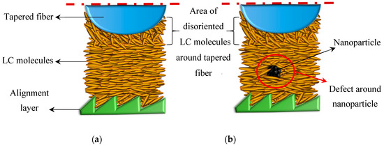 In general, the different refractive index of a waveguide cladding (LC around tapered fiber) depends on the orientation of n-director molecules in the external electric field. However, around the taper, an area of disoriented LC molecules is formed which is attached to the fiber as it is shown in Figure 7 [32]. This part of the LC cannot be reoriented even with a high voltage, which is connected to adhesive strength between glass and LC molecules. Nevertheless, its diameter is smaller than the wavelength. Hence, it will not be under investigation in this paper. It also should be noticed that in this investigation only the medium refractive index, which can be described as the medium molecules’ director, is taken under consideration. In the doped LC topological defects are induced around nanoparticles (See Figure 7). Even small amounts of NPs significantly influence the properties of bulk material due to intermixing NP effects on alignment layers and bulk properties [33]. Additionally, we can predict that in a temperature change process NPs will be new small centers of expanding temperature.