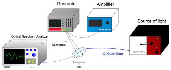 Applied voltage influence on changes in spectral characteristics was investigated. Figure 8 shows the scheme of an optical system for measuring changes in spectral characteristics depending on voltage. For the measurement a high-power supercontinuum laser (SuperK EXTREME, NKT Photonics, Southampton, UK) (since light operates in the wavelength range of 400–2400 nm), an optical spectrum analyser with the spectral range of 350–1200 nm, (AQ6373, Yokogawa, Tokyo, Japan), signal generator (DG1022, RIGOL Beijing; China), and voltage amplifier (A400D, FLC Electronics, Molndal, Sweden) were used.