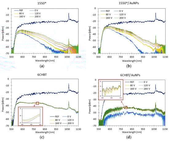 Spectra obtained for LCs: (a) 1550* (pure); (b) 1550* + 0.1 wt% AuNPs; (c) 6CHBT (pure); (d) 6CHBT + 0.1 wt% AuNPs, for different steering voltage in the range U of 0–200 V.