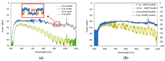 Spectral characteristics in the wavelength range of 550–1150 nm for applied 200 V signal amplitude. The square shape of modulation with a frequency of 5 Hz and 10 Hz has been applied (a) pure liquid crystals; (b) liquid crystals doped with 0.1 wt% AuNPs.