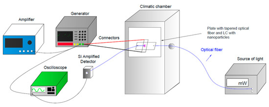 The application of different LC mixtures influences speed of device operation and answer time to measurement parameters). The scheme of the optical system for measuring time courses depending on voltage and temperature is shown in Figure 11. For the measurement we used as a source of light a single mode fiber pigtailed laser (LP852-SF30, ThorLabs, Newton; USA) operating at the center wavelength of 846 nm, a signal generator (DG1022, RIGOL, Beijing; China), voltage amplifier (A400D, FLC Electronics, Molndal; Sweden), an Si-amplified detector operating in the wavelength range of 350–1100 nm, and a climatic chamber (VCL 7010, Votsch Industrietechnik, Balingen, Germany) for temperature measurement in the temperature range of −70 to 180 °C.