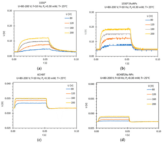 Time courses obtained for the steering voltage range of U = 80–200 V at room temperature (25 °C) for: (a) 1550* (pure); (b) 1550* + 0.1 wt% AuNPs; (c) 6CHBT (pure); (d) 6CHBT + 0.1 wt% AuNPs.