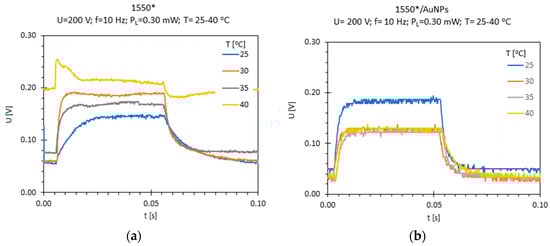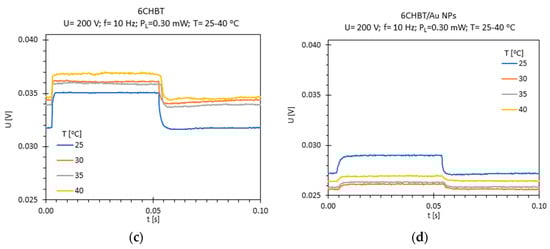 Time courses obtained for the steering voltage U = 200 V at the temperature range of T = 25–40 °C for: (a) 1550* (pure); (b) 1550* + 0.1 wt% AuNPs; (c) 6CHBT (pure); (d) 6CHBT + 0.1 wt% AuNPs.