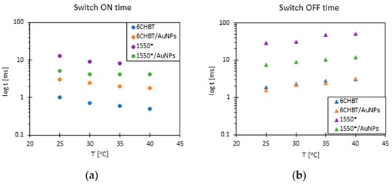 (a) Switch ON and OFF time for a for 1550* and (b) 6CHBT (pure), 1550* + 0.1 wt% AuNPs; and 6CHBT + 0.1 wt% AuNPs.
