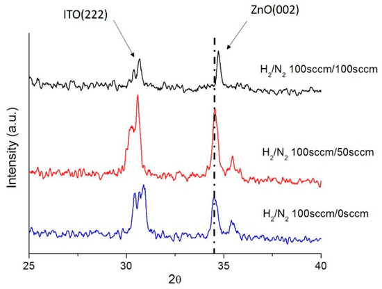 X-ray diffractometer patterns of S1, S2, and S3 are presented in Figure 2, in which two peaks corresponding to the (002) of ZnO and the (222) of ITO may be observed. The peak with respect to (002) of ZnO is seen to slightly shift to a higher angle and its full width at half maximum (FWHM) decreases with increasing N2 flow.