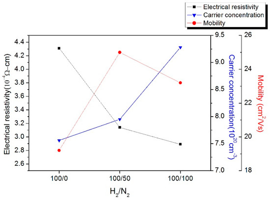 Electrical properties of the H2/N2 plasma processed AZO/ITO films.