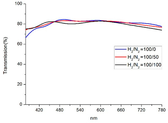 Transmission spectra of the H2/N2 plasma with different N2 flow processed AZO/ITO films.