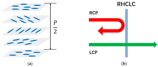 CLC is also called chiral nematic liquid crystal. Under the action of the chiral dopant, the nematic LC directors rotate along the normal direction of the plane, but in the same layer, all the LC directors are oriented in the same direction as shown in Figure 1a. The axial length over which the LC directors rotate by 180° is half pitch P/2. When light wavelength is within the reflection band of a CLC, the circularly polarized light with the same helical sense would be reflected, while the circularly polarized light with the opposite handedness would be transmitted. For both the reflected and transmitted light, polarization states are unchanged. For example, a right-handed CLC (RHCLC) exhibits a high reflection characteristic for right-handed circular polarization (RCP) and a high transmission characteristic for left-handed circular polarization (LCP) as shown in Figure 1b, and vice versa.