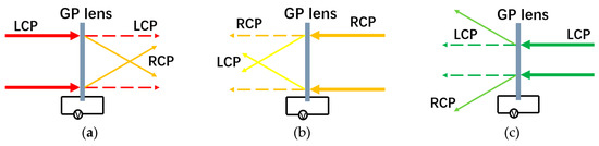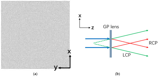 where (x, y) is the initial phase of the incident light. The output light consists of two components: a handedness inverted first-order circular polarization and a handedness unchanged zero-order circular polarization. The coefficient η = sin2(Γ/2) is the first-order diffraction efficiency and η0 = cos2(Γ/2) is the zero-order diffraction efficiency, where Γ is the phase retardation. When half-wave retardation is satisfied (Γ =), the first-order efficiency could theoretically reach 100% [13,19]. The phase shift term ±2φ in the first-order indicates that the sign of the additional phase is opposite for LCP and RCP. Therefore, a GP lens converges light of one circular polarization and diverges light of the other as illustrated in Figure 2b.