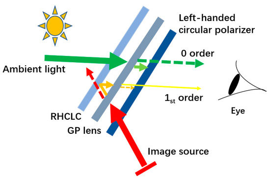 For the virtual information light coming from the image source, it first encounters the left-handed circular polarizer and gets converted into the LCP. Next, the LCP light passes through the GP LC lens and gets diffracted. For this specific GP lens, its phase profile is designed in such a way that it exhibits a positive optical power for LCP light coming from the driver’s side. So the first-order light is converged, and its handedness inversed, while the zero order remains left-handed as shown in Figure 4a. As they further proceed to the RHCLC film, the first order RCP is reflected towards the driver’s side because of chirality match, while the zero order LCP is transmitted into the other side. Upon reflection, the first order light remains to be RCP thanks to the reflectivity characteristic of the CLC.