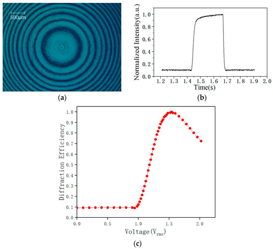 GP lens (a) optical micrograph under crossed polarizers; (b) response time; and (c) voltage-dependent first-order diffraction efficiency.