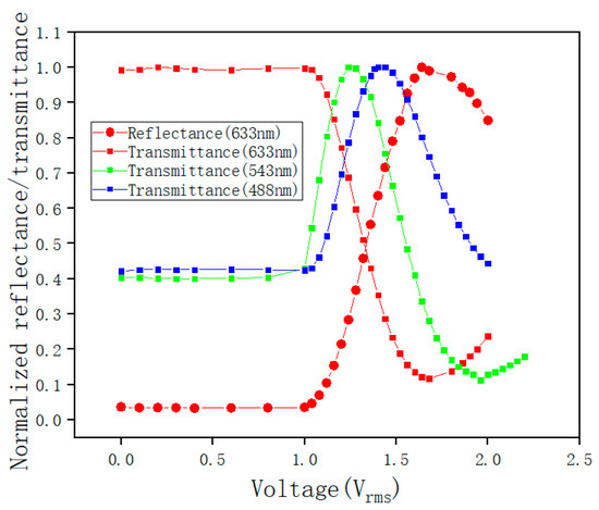 Voltage-dependent reflectance (632 nm laser) and transmittance (633 nm, 543 nm, and 488 nm lasers) of the system.