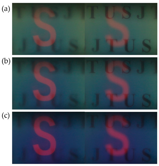 Photos focused on the virtual-information image and the background, respectively, at different voltages (a) 1.68 Vrms, (b) 1.80 Vrms, and (c) 1.96 Vrms.