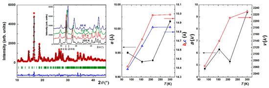 Left: Powder X-ray diffraction pattern of Fe(3,4-dimethyl-pyridine)2[Ag(CN)2]2 at room temperature. Experimental (red symbols) and calculated patterns (black line), and Bragg peak positions (vertical green marks). Inset: detail of the experimental patterns at room temperature, 210 K, 155 K and 80 K; the arrows indicate the positions of the (0 2 2) and (2 0 0) reflections. Middle: lattice parameters obtained by powder X-ray diffraction vs. temperature. Right: thermal displacement parameter and cell volume vs. temperature.