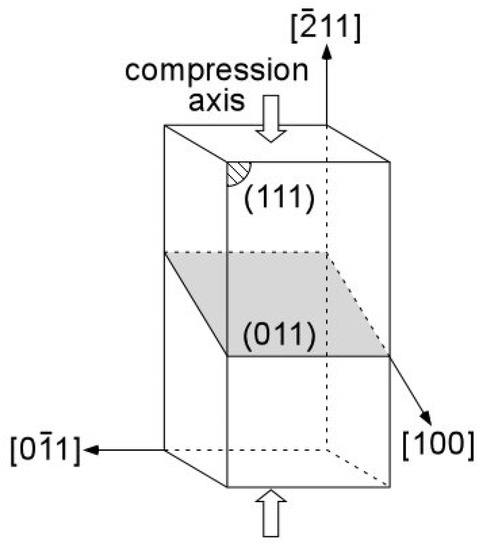 Rectangular samples approximately 1 × 1 × 2 mm3 in size were cut out and used for the deformation tests. The compression axis and the strain rate were carefully chosen so as to introduce dislocations satisfying the condition in Equation (1). Figure 1 shows the crystallographic orientations of the samples for deformation. The compression axis was set to the direction, in which the primary slip system is sufficiently suppressed. According to a previous study that used the etch pit method on the dislocations, which were introduced by plastic deformation of Bi [15], the slip system should be activated with the orientation relationship shown in Figure 1, where the Schmid factor for the slip system and the primary slip systems is 0.46 and 0, respectively. Here, it should be noted that satisfies Equation (1), while does not. Although the . direction is another possible compression axis to activate the slip system [13,15], the direction is advantageous to activate a single slip system . In our previous study [13], the compression axis was the direction declined by a few degrees from the direction toward the direction, where a single slip system out of the three equivalent slip systems of is activated. However, with the compression axis, as the deformation proceeds, the possibility that other two equivalent slip systems, and , are activated increases. Therefore, we consider that the direction is better than the direction to activate a single slip system out of the three equivalent slip systems of . The strain rate was set to be approximately 1 × 10−5 s−1 to avoid twin formation. Twinning deformation easily occurs at a strain rate of 1 × 10−3 s−1 [16,17] and is suppressed at a strain rate of 1 × 10−4 s−1 or lower [15,18]. The rectangular samples were deformed by compression at room temperature up to 10%.