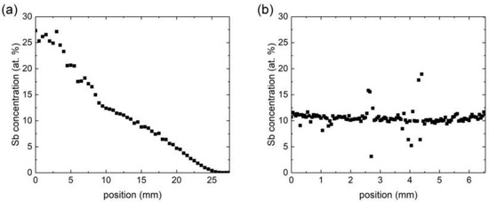 Electron probe microanalyzer (EPMA) line profiles of Sb concentrations obtained for the grown crystal. (a) EPMA line profile along the crystal growth direction; (b) EPMA line profile perpendicular to the crystal growth direction.