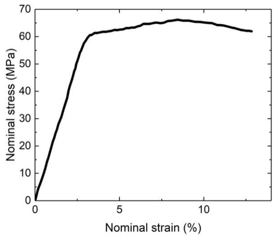 Stress–strain curve of the bismuth antimony (Bi1−xSbx) sample deformed at room temperature under a constant strain rate of 1 × 10−5 s−1. The Sb concentration of the deformed sample was in the range of 8.6–9.8 at%.