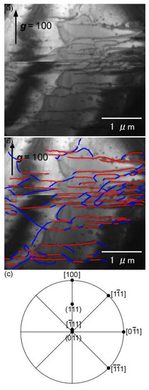 (a) TEM bright-field images obtained from the specimen cut out from the deformed sample; (b) the same images as in (a). Dislocations along the direction are indicated by red lines and dislocations that deviate from the direction more than are indicated by blue lines; (c) stereographic projection of Bi1−xSbx.