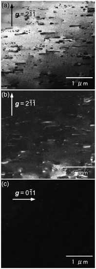 For analyses to investigate the Burgers vector, TEM observations were performed for the plane. Figure 5a shows a typical TEM bright-field image obtained from the slip plane of the deformed sample. Since the intersection of the plane and the slip plane was parallel to the direction, straight dislocations along the direction were observed. Figure 5b,c shows TEM dark-field images obtained from the same region as in Figure 5a, using and , respectively. As a result of analyses, the contrast of the dislocations vanished with . Thus, the Burgers vector was considered to be perpendicular to the direction. The primitive translation vector that is perpendicular to the direction in the slip plane is . Consequently, the Burgers vector of the introduced dislocations was determined to be , which satisfies Equation (1). Dislocations with other Burgers vectors were not found in our TEM observations. This result suggests that longer dislocations with controlled orientations can be obtained by mild plastic deformation without severe work hardening. Since the dislocations had long segments along the direction, which is perpendicular to the Burgers vector, the observed dislocations were mostly of the edge type. The length of the edge components was approximately a few micrometers. Here, it should be noted that the actual dislocation length could be longer than the observed one because of the difference between the slip plane and the surface of the TEM specimen; the dislocations on the slip plane were inevitably intersected by the surface of the TEM specimen.