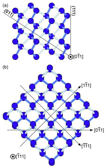 The finding that the dislocations were mostly edge dislocations could be interpreted in terms of the Peierls stress. Bi1−xSbx with a rhombohedral crystal structure has a cleavage on the plane. Figure 6a,b shows the atomic structure of Bi1−xSbx viewed along the and directions, respectively. The direction is tilted from the normal direction of the slip plane toward the direction. Atomic planes parallel to the plane are arranged in double layers as shown in Figure 6a. The interatomic distance in a double layer is shorter than that between adjacent double layers [21]. Therefore, in the plane, the interatomic distance along the direction is larger than that along the direction. In addition, it can be assumed that the shorter bonds are stronger and the longer bonds are weaker. Thus, the Peierls stress along the direction should be higher than that along the direction. Accordingly, it can be considered that, for mobile dislocations in the plane, the edge segments along the direction, which are trapped along the valley of the Peierls potential, require higher stress to glide, thus leading to their lower mobility. In addition, dislocation segments along the and directions observed in Figure 4 are also expected to be stable because they are along the atomic columns as shown in Figure 6b. Resultant long dislocation segments are expected to have an advantage in dislocation conduction measurements. Furthermore, such long dislocations aligned in one direction may be useful for future device applications.