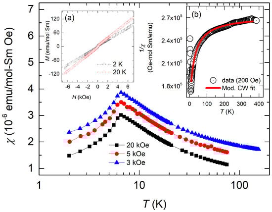 The magnetization isotherms, , at 2 K and 20 K showed in the inset panel (a) present only very weak hysteresis loops or saturation effects of magnetization. Even with the application of 70 kOe, the maximum magnetization attained is only about 0.12 Sm which is lower than the free-moment value. A detailed understanding of the magnetic structure of this compound via neutron diffraction is rendered difficult because of the strong absorption cross-section of Sm. The inset (b) of Figure 2 shows the 1/ curve obtained at applied field of 200 Oe. The inverse magnetic susceptibility is strongly curvilinear in the entire temperature range which is typical for Sm-compounds where the and terms are close in energy [,]. Hence, the simplest form of Curie-Weiss description did not reproduce the observed magnetic susceptibility. A modified Curie-Weiss formula [],