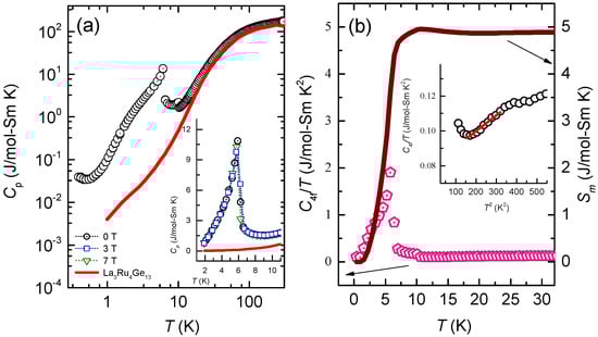The specific heat, , of SmCoGe in the temperature range 0.4 K-300 K, in zero magnetic field is shown in the main panel of Figure 3a using circles as markers. Shown also in the figure is the of a non-magnetic analogue, LaCoGe as a solid line. A sharp peak is observed at 6 K which signifies a transition, probably of antiferromagnetic nature. The shows a weak hump near 1.5 K and a gradual rise below 0.8 K towards 0.4 K. The inset of (a) shows the for 2 K-12 K in applied fields of 3 T and 7 T. The phase transition which was evident in magnetization is reflected in at 6 K. A remarkable feature in the specific heat of SmCoGe is the fact that a magnetic field as high as 7 T has negligible effect on the peak at . In the inset of (a), the temperature region below 10 K is shown magnified to highlight the robust nature of the phase transition in applied magnetic field. Field-insensitiveness of specific heat was observed in our previous work on the Sm-based intermetallic, SmRuGe []. A field-insensitive nature of this kind can arise from the multipolar order of the magnetic moments, which are not perturbed by the applied magnetic fields.