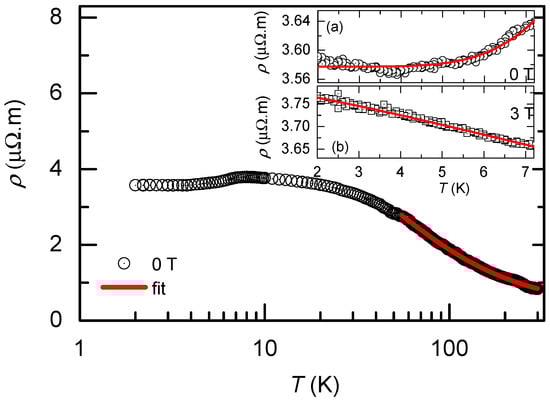 where, is the residual resistivity and b is equivalent to the semiconducting energy gap and c is a constant. From the fit, b = 37 meV is obtained. As shown in the main panel of Figure 4, the fit using such an expression faithfully reproduces the observed . It can be seen that the semiconducting nature of is taken care of by the exponential expression. In order to analyze the resistivity behavior in the magnetically ordered temperature region, use was made of the expression accounting for the electron scattering by spin waves [],