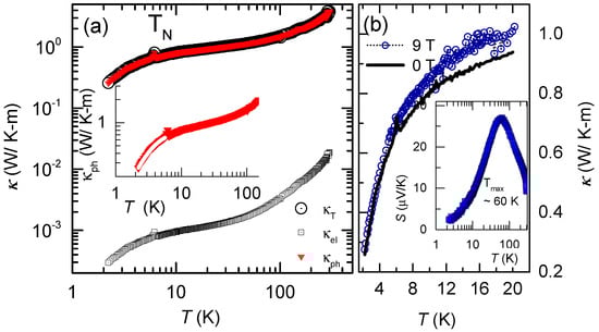 (a) The total thermal conductivity, , separated in to electronic () and lattice () contributions. The magnetic phase transition at is seen in also. The inset shows the along with a curve-fit to the region below the as . (b) The in 0 T and 9 T. Only a slight change in is effected with the application of 9 T, that too above the . The Seebeck coefficient, S is plotted in the inset of (b).