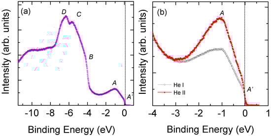 In order to understand the nature of energy bands contributing to the near- density of states (DOS) in SmCoGe we performed ultra-violet photoelectron spectroscopy. The valence band spectra of SmCoGe taken by using He II (40.8 eV) at 300 K depict five features as shown in Figure 6a. The features marked as (−0.07 eV), A (−0.95eV), B (−4.3 eV) originate predominantly from the Co ()-Sm() hybridized states while features marked C and D occurring at −5.65 eV and −6.3 eV, respectively, constitute the Ge states [,]. The higher resolution spectra shown in panel (b) collected using two different photon energies (He I and He II) show the feature A and weak shoulder more clearly.